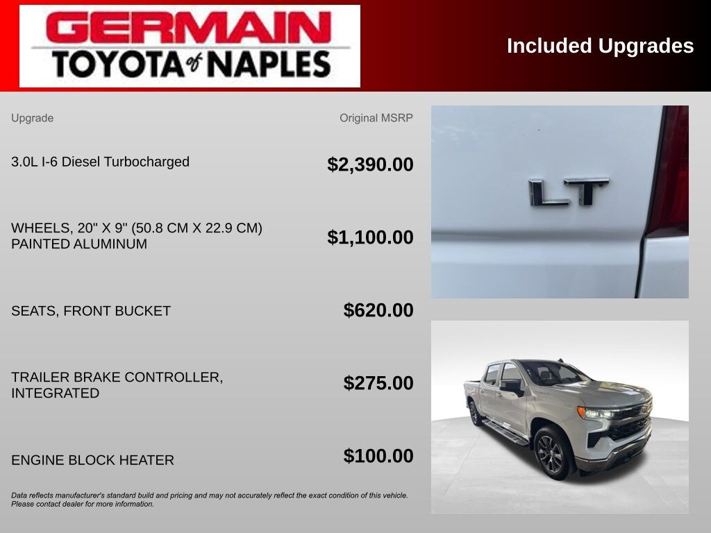 Local Trade, Rear View Camera, 10-Speed Automatic, Black Cloth, 10-Way Power Driver Seat w/Lumbar, 12.3" Multicolor Reconfigurable Digital Display, 120-Volt Bed Mounted Power Outlet, 120-Volt Instrument Panel Power Outlet, 2 USB Data Ports, 220 Amp Alternator, 3.23 Rear Axle Ratio, 4-Wheel Disc Brakes, 40/20/40 Front Split-Bench Seat, 6 Speakers, 6-Speaker Audio System, ABS brakes, Air Conditioning, All-Star Edition, Alloy wheels, AM/FM radio: SiriusXM with 360L, Apple CarPlay/Android Auto, Auto High-beam Headlights, Auto-Locking Rear Differential, Automatic Emergency Braking, Automatic temperature control, Bluetooth® For Phone, Brake assist, Bumpers: chrome, Chevrolet Connected Access Capable, Chrome Mirror Caps, Cloth Seat Trim, Color-Keyed Carpeting Floor Covering, Compass, Convenience Package, Deep-Tinted Glass, Delay-off headlights, Driver door bin, Driver vanity mirror, Dual front impact airbags, Dual front side impact airbags, Dual Rear USB Ports (Charge Only), Dual-Zone Automatic Climate Control, Electric Rear-Window Defogger, Electrical Steering Column Lock, Electronic Cruise Control, Electronic Stability Control, Electronic Transmission Range Selector Shifter, Engine Block Heater, EZ Lift Power Lock & Release Tailgate, Floor Mounted Center Console, Following Distance Indicator, Forward Collision Alert, Front anti-roll bar, Front Bucket Seats, Front Center Armrest w/Storage, Front dual zone A/C, Front Pedestrian Braking, Front reading lights, Front Rubberized Vinyl Floor Mats, Front wheel independent suspension, Fully automatic headlights, HD Rear Vision Camera, Heated door mirrors, Heated Driver & Front Outboard Passenger Seats, Heated front seats, Heated Power-Adjustable Outside Mirrors, Heated Steering Wheel, Heated steering wheel, High Capacity Suspension Package, Hitch Guidance, Illuminated entry, Inside Rear-View Mirror w/Tilt, Integrated Trailer Brake Controller, IntelliBeam Automatic High Beam On/Off, Keyless Open & Start, Lane Keep Assist w/Lane Departure Warning, LED Cargo Area Lighting, Low tire pressure warning, Not Equipped w/Steering Column Lock, Occupant sensing airbag, OnStar & Chevrolet Connected Services Capable, Outside temperature display, Overhead airbag, Overhead console, Panic alarm, Passenger door bin, Passenger vanity mirror, Power door mirrors, Power driver seat, Power Front Windows w/Driver Express Up/Down, Power Front Windows w/Passenger Express Down, Power Rear Windows w/Express Down, Power steering, Power windows, Preferred Equipment Group 1LT, Premium audio system: Chevrolet Infotainment 3 Premium, Radio data system, Radio: Chevrolet Infotainment 3 Premium System, Rear 60/40 Folding Bench Seat (Folds Up), Rear reading lights, Rear Rubberized-Vinyl Floor Mats, Rear step bumper, Rear window defroster, Remote keyless entry, Remote Start Package, Remote Vehicle Starter System, Security system, SiriusXM w/360L, Speed control, Speed-sensing steering, Split folding rear seat, Standard Suspension Package, Standard Tailgate, Steering Wheel Audio Controls, Steering wheel mounted audio controls, Tachometer, Telescoping steering wheel, Theft Deterrent System (Unauthorized Entry), Tilt steering wheel, Traction control, Trailering Package, Trip computer, Variably intermittent wipers, Voltmeter, Wheels: 17" x 8" Bright Silver Painted Aluminum, Wheels: 20" x 9" Painted Aluminum, Wi-Fi Hot Spot Capable, Wireless Charging, Wireless Phone Projection, Wrapped Steering Wheel, 10-Speed Automatic, Black Cloth.