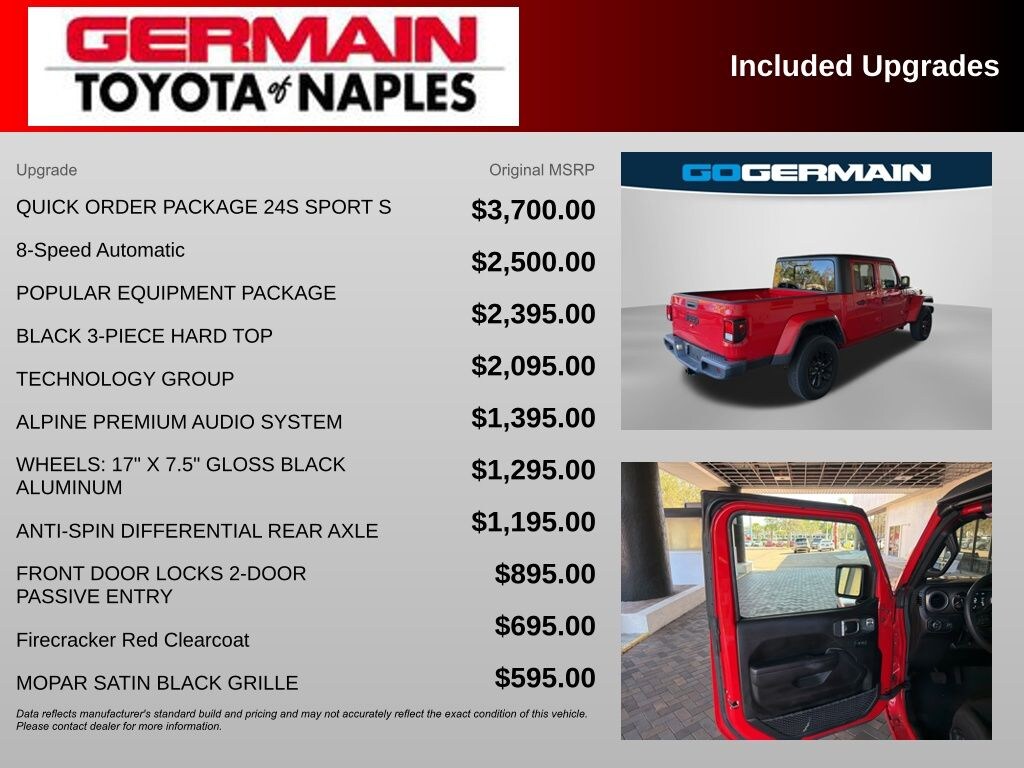Jeep Firecracker Red Clearcoat 2023 Gladiator Sport Local Trade In, Carfax 1-Owner. 4D Crew Cab 3.6L V6 24V VVT 8-Speed Automatic 4WD